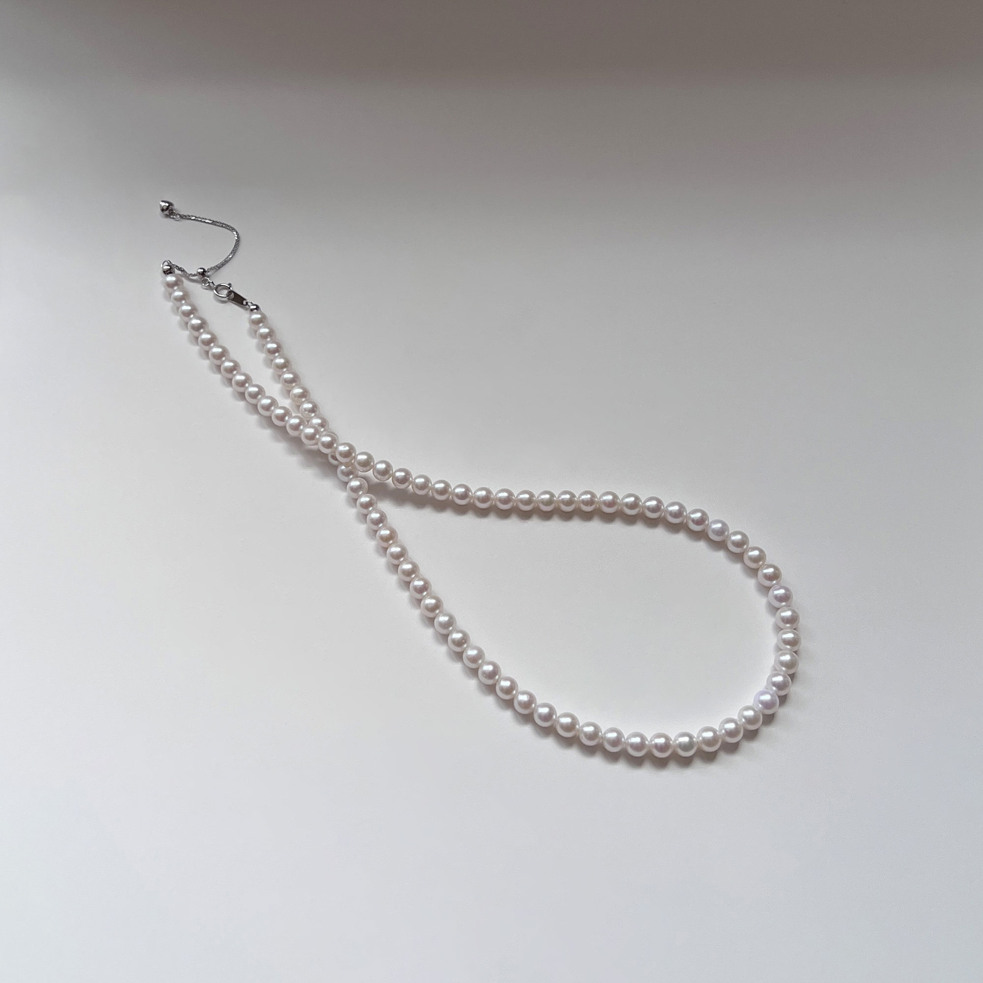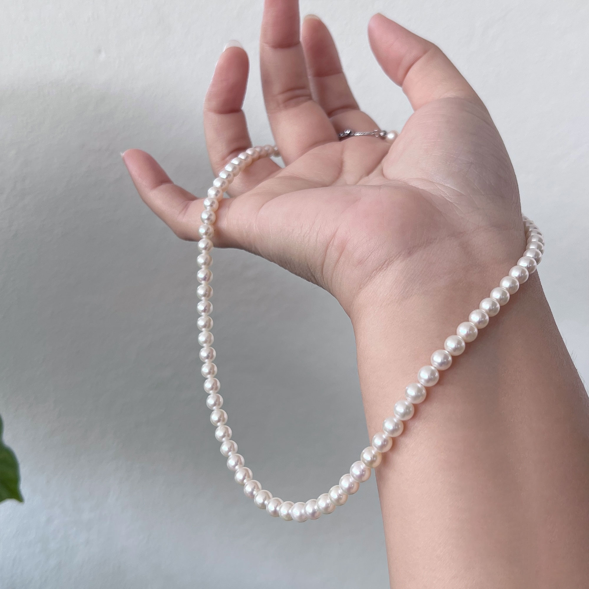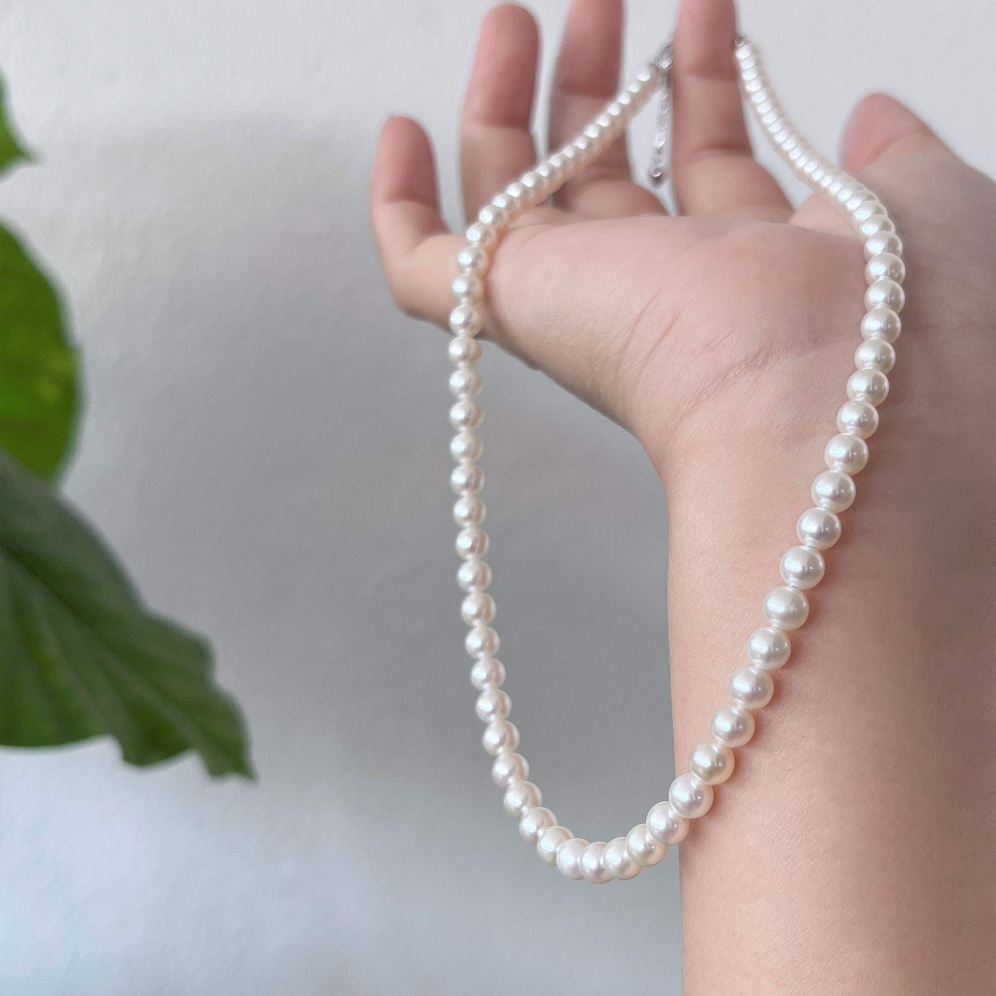 A timeless essential with a soft, elegant glow. This necklace features carefully selected freshwater pearls in a warm white to light cream tone, offering a gentle, flattering radiance against the skin. The luster is luminous yet refined, perfect for both everyday wear and special occasions.