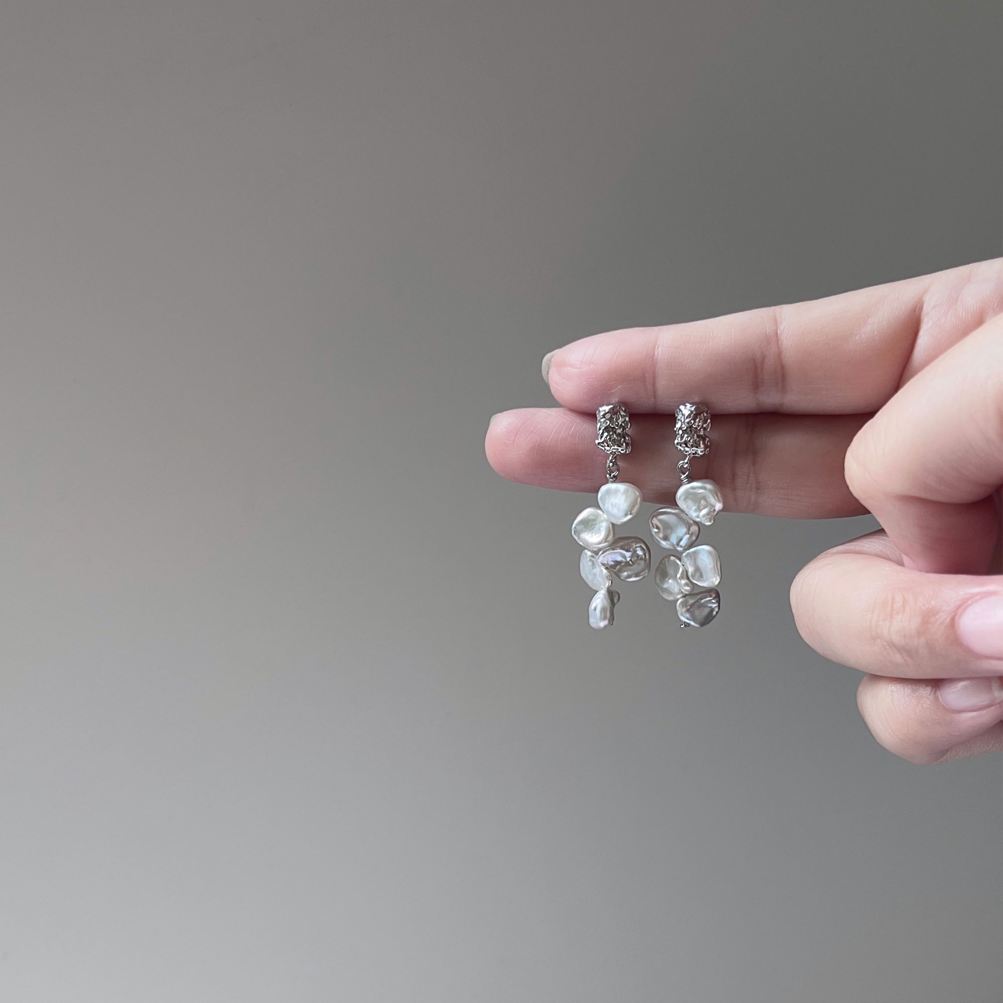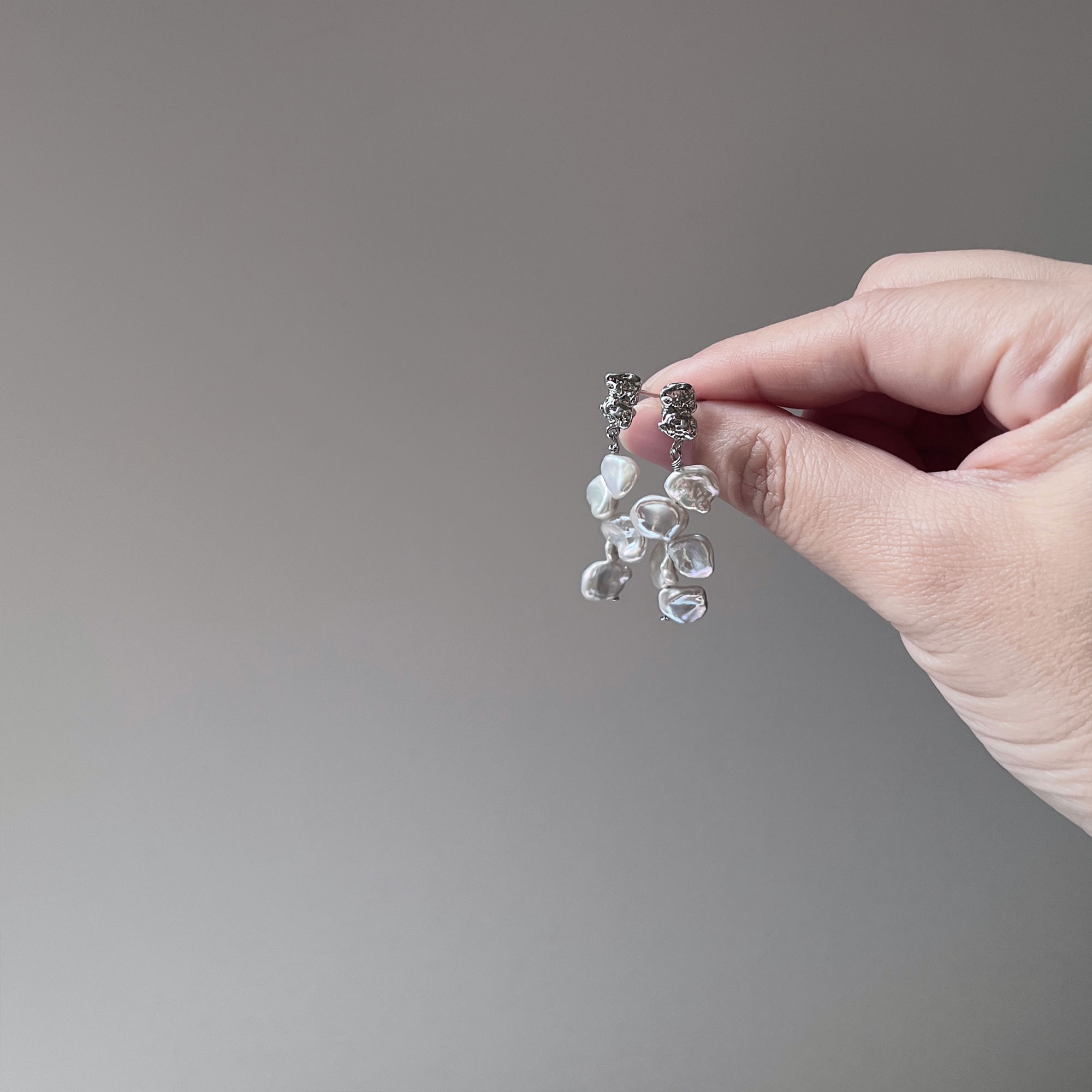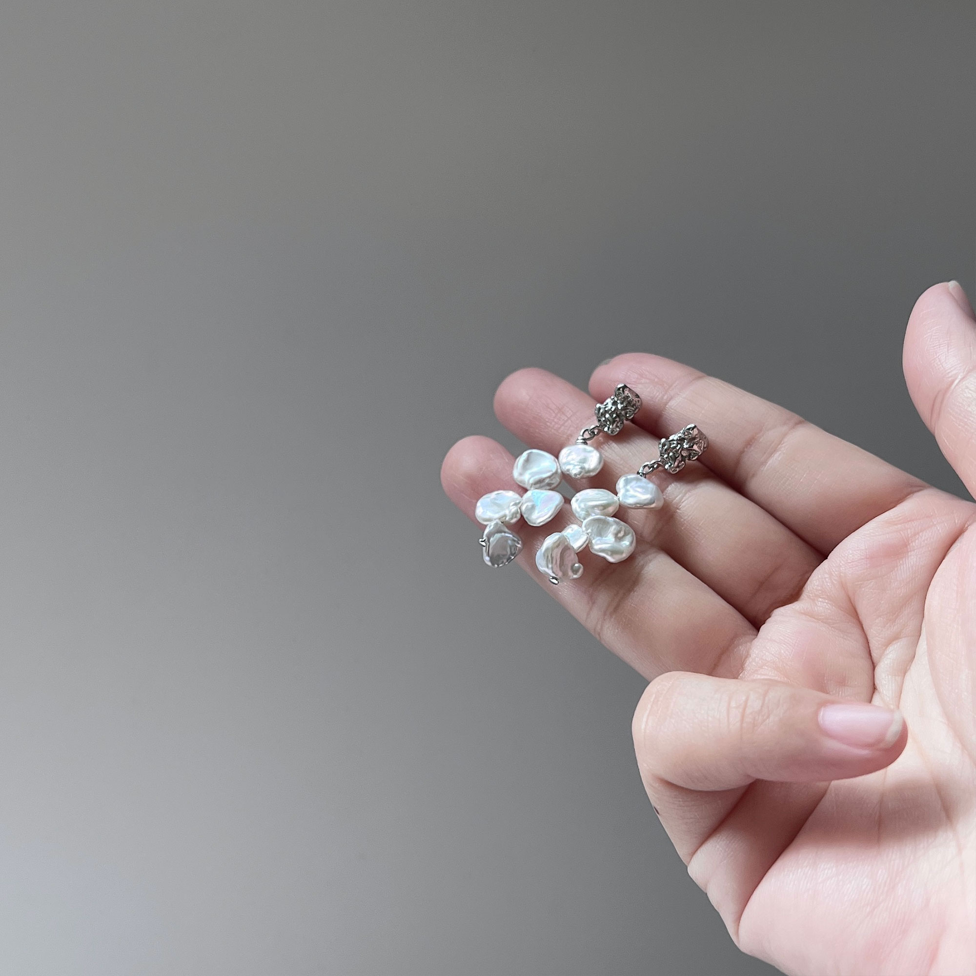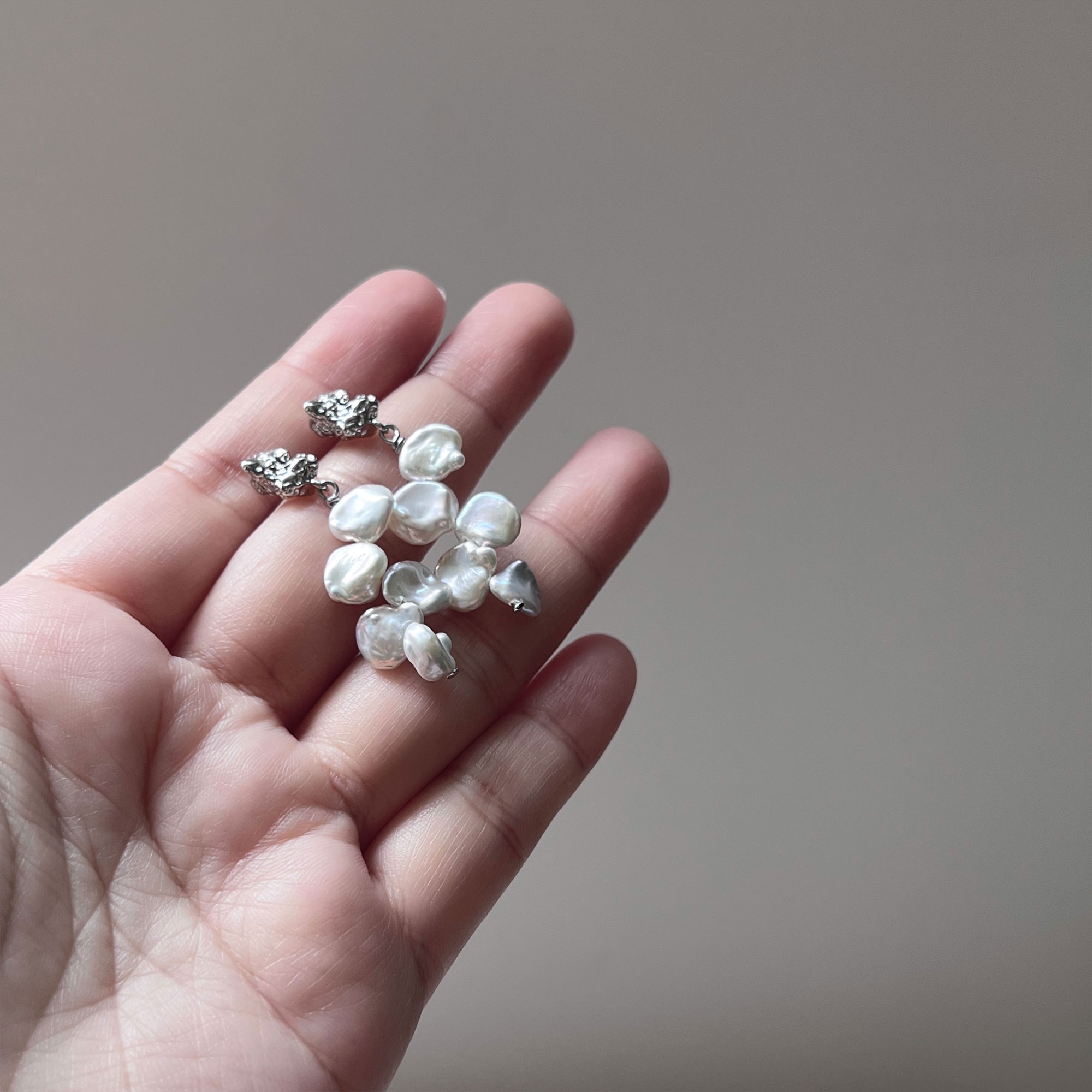 An absolutely gorgeous pair of pearl earrings with clusters of organically shaped, freshwater white Keshi pearls dangling from silver chains. Look like flowers trickling down.