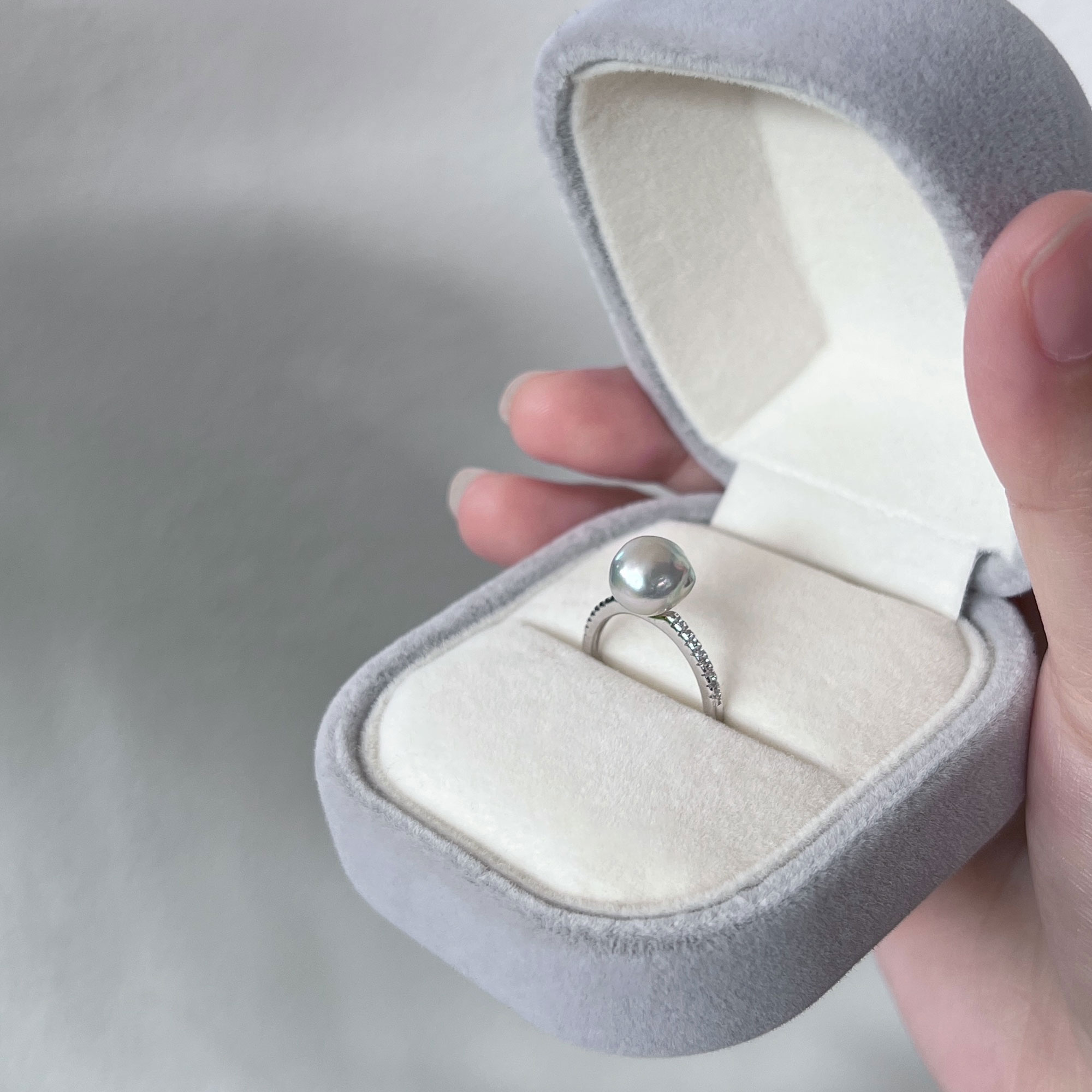 This ring features a silvery blue baroque Akoya pearl, prized for its exceptional luster and cool-toned elegance. The pearl’s organic, freeform shape gives each piece a unique character, while its mirror-like sheen reflects light with a soft, luminous glow.