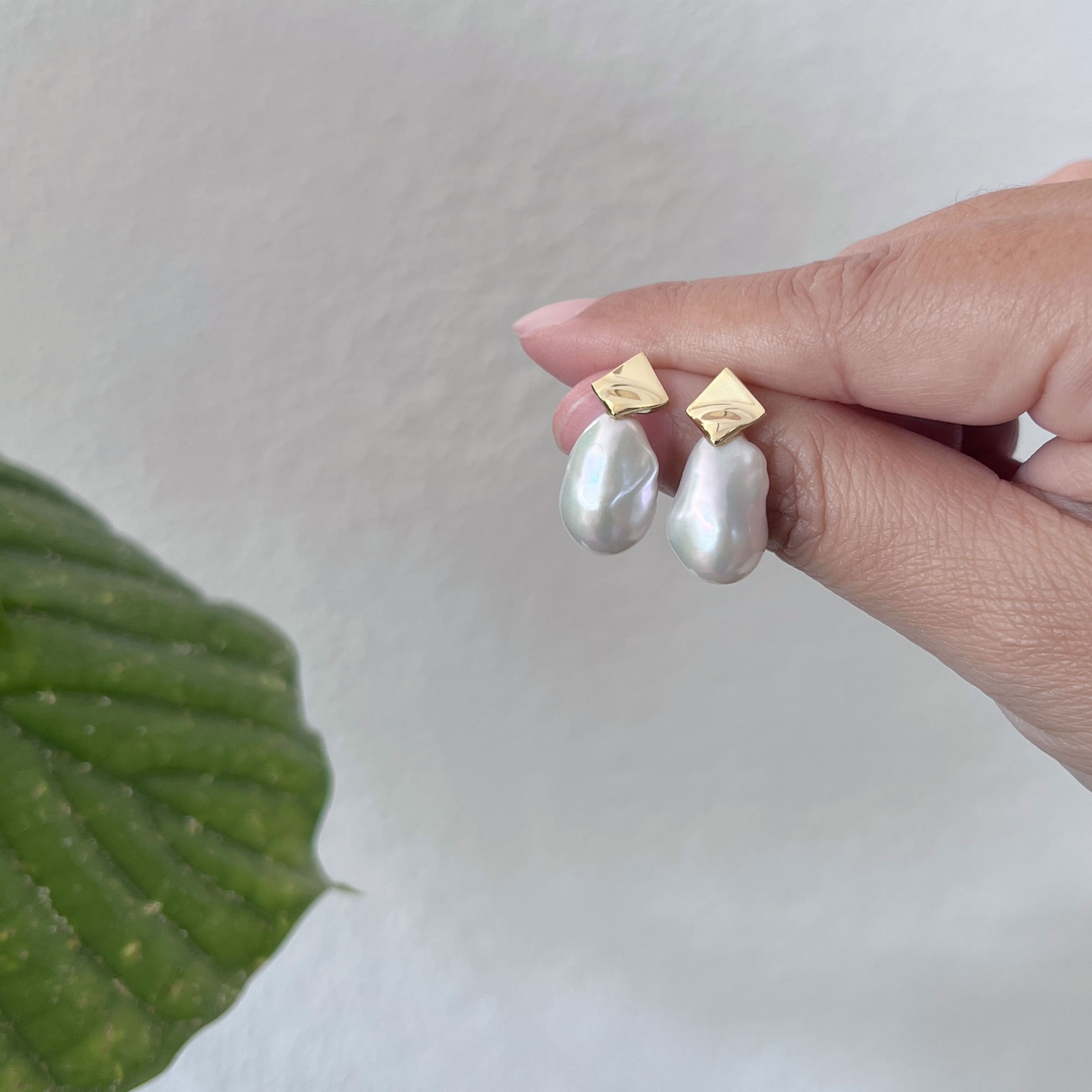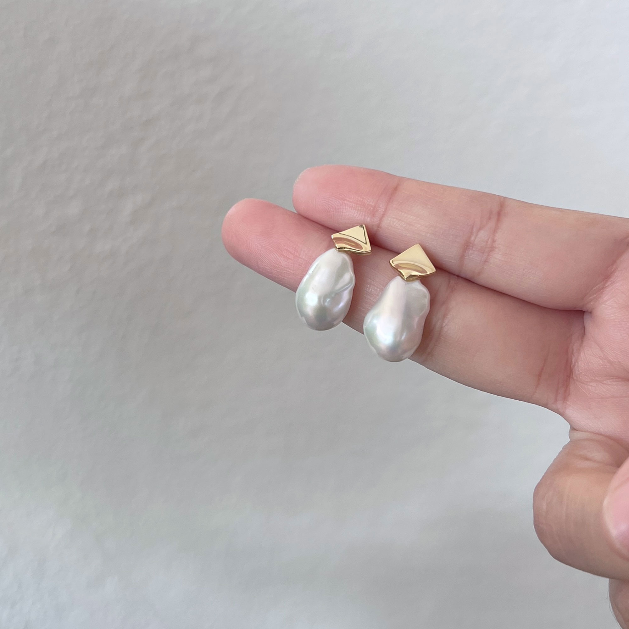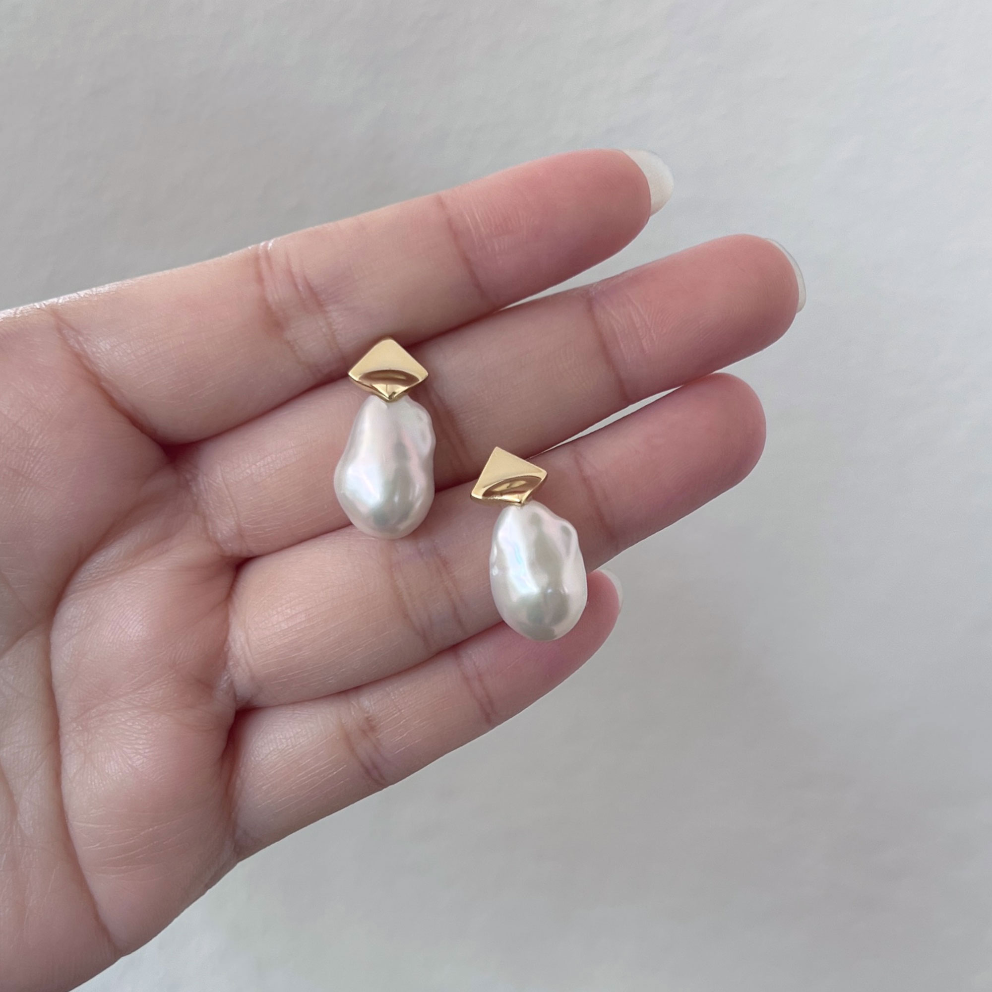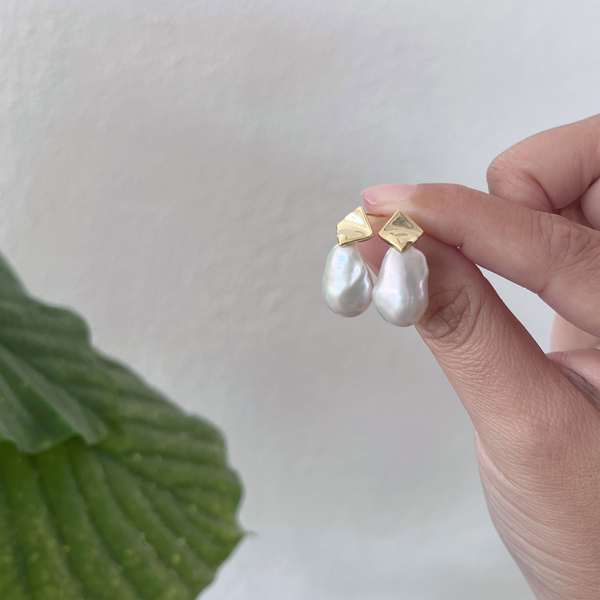 A modern take on timeless elegance, these earrings feature lustrous baroque freshwater pearls suspended from sleek geometric studs. Each pearl is naturally formed, showcasing its own organic shape and soft iridescence, making every pair truly one of a kind.