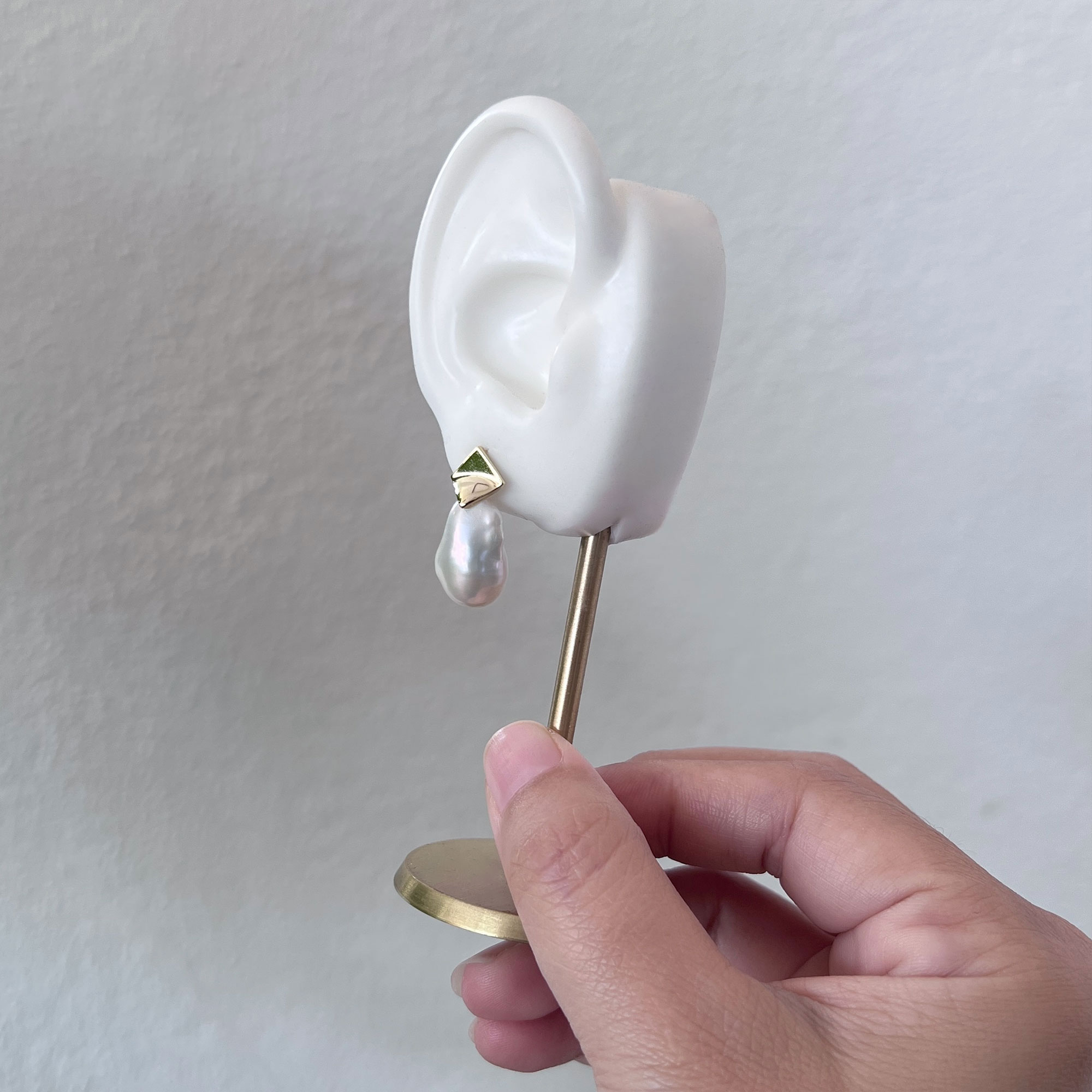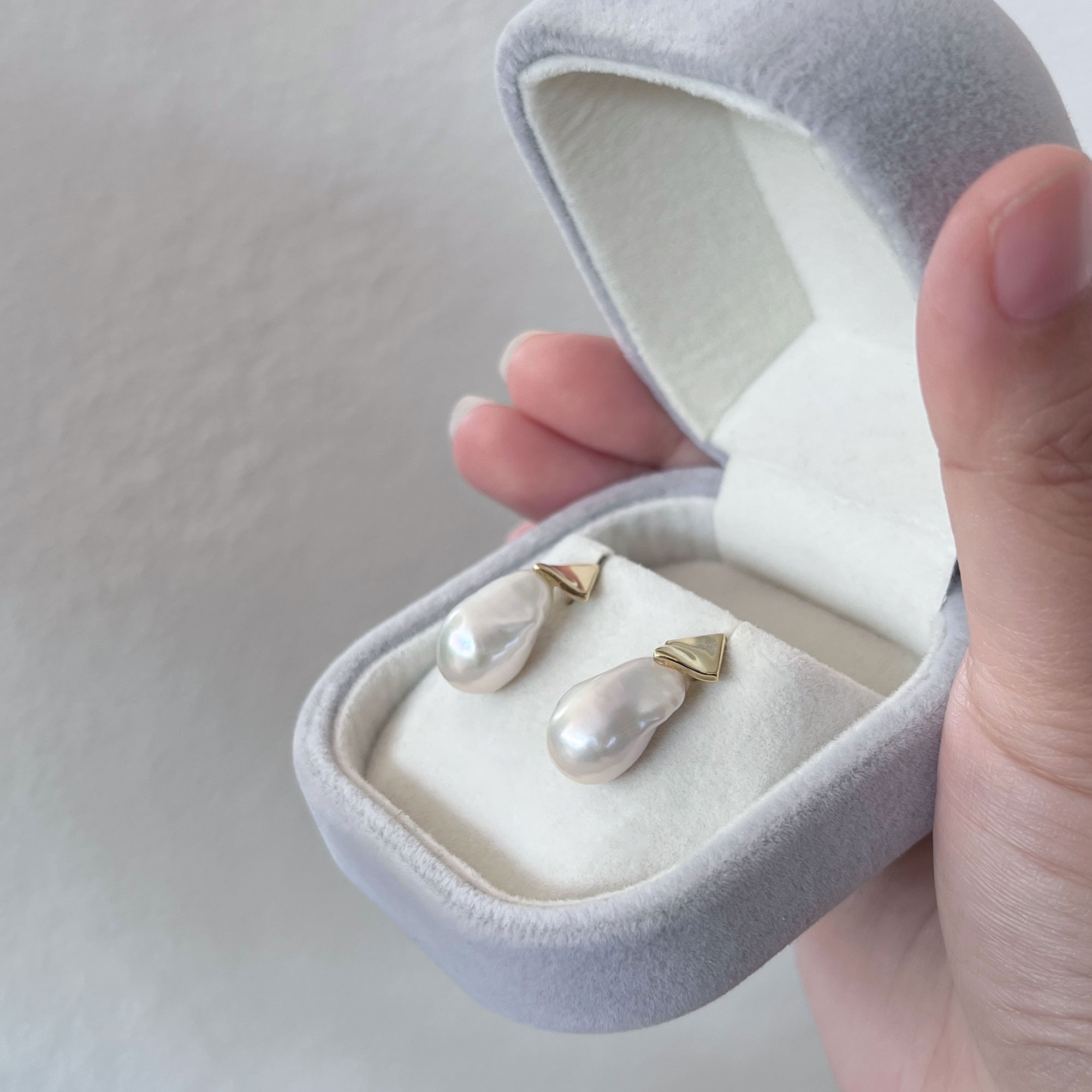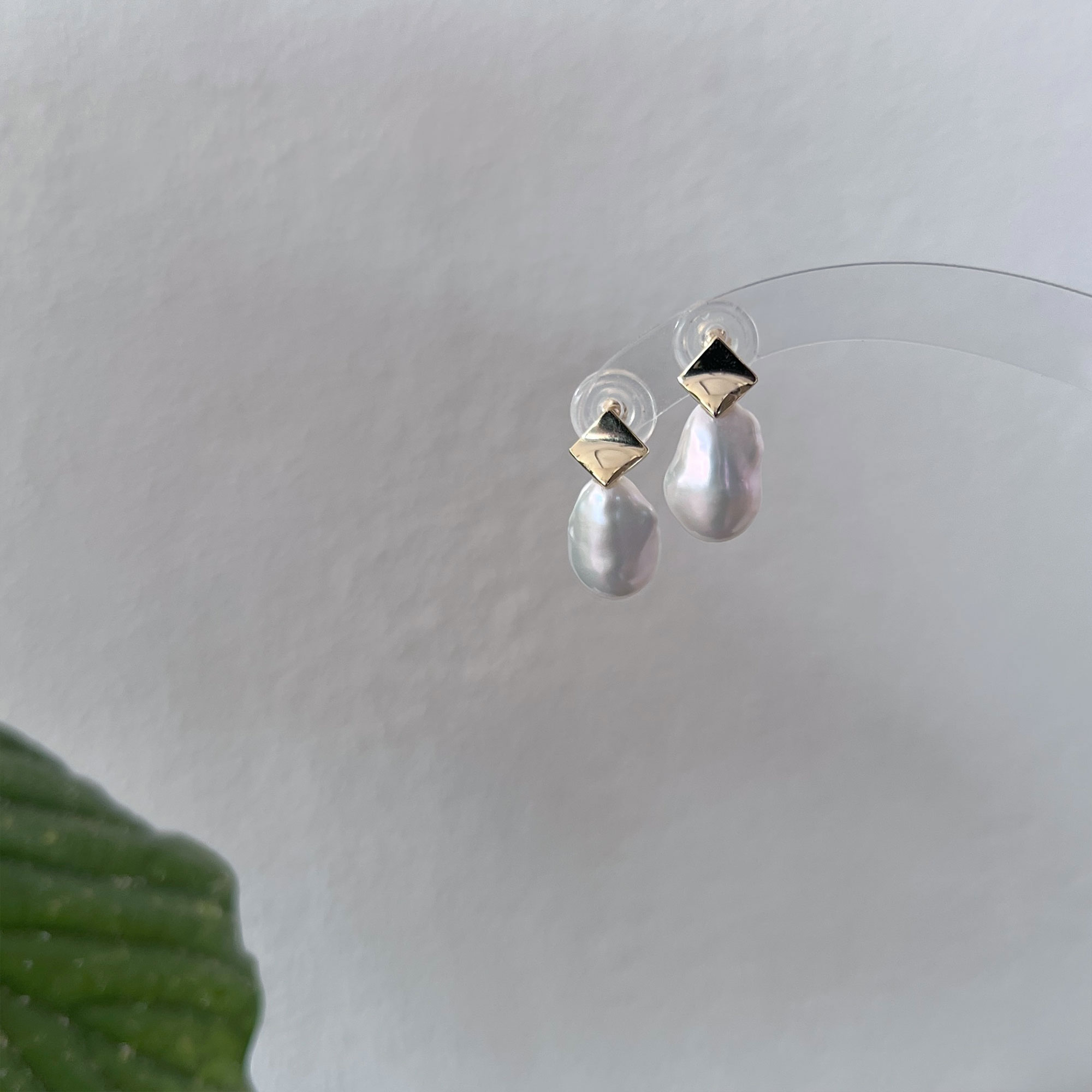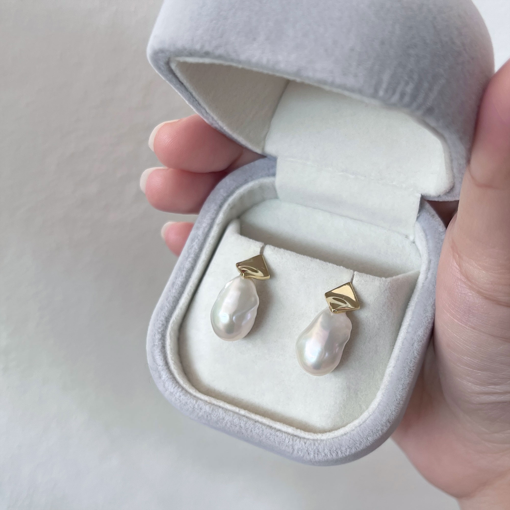 A modern take on timeless elegance, these earrings feature lustrous baroque freshwater pearls suspended from sleek geometric studs. Each pearl is naturally formed, showcasing its own organic shape and soft iridescence, making every pair truly one of a kind.
