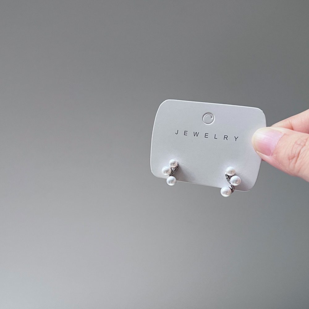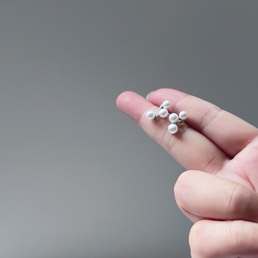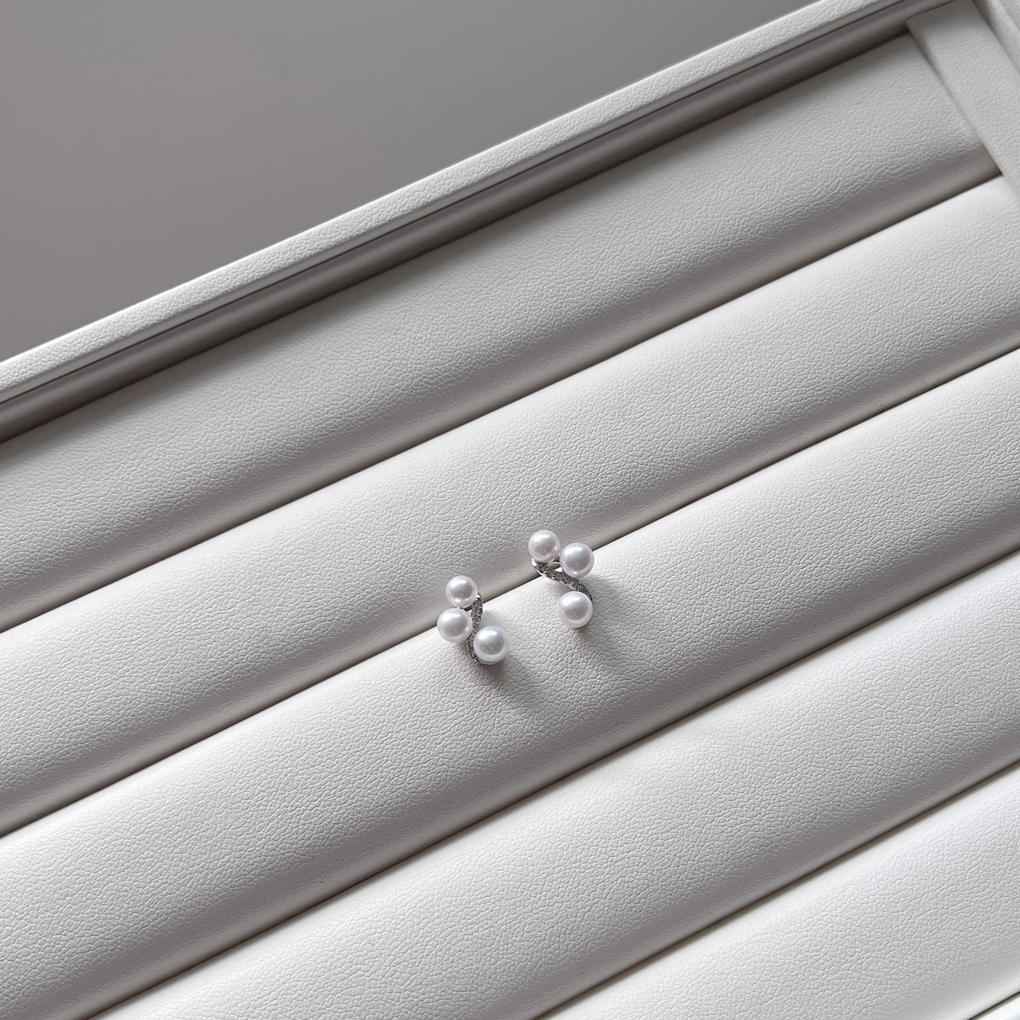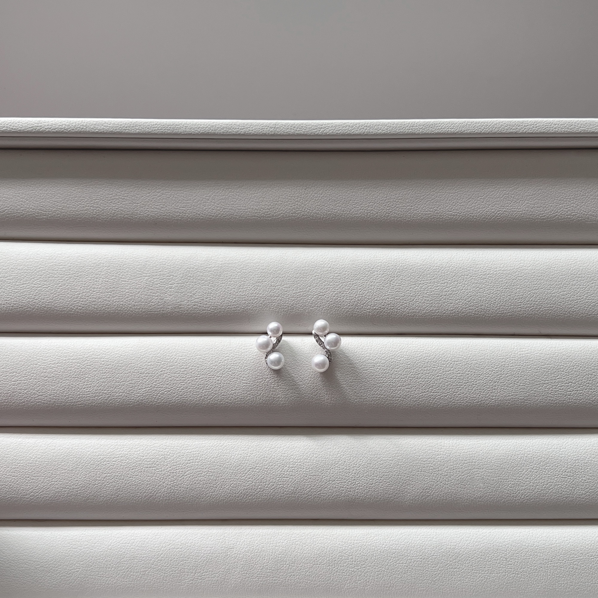 Delicately crafted Freshwater Pearl Earrings featuring a modern twist design. Each stud showcases three lustrous pearls set on a silver-curved base embellished with tiny Cubic Zirconia accents, creating a subtle sparkle. Perfect for adding elegance to both casual and formal looks.